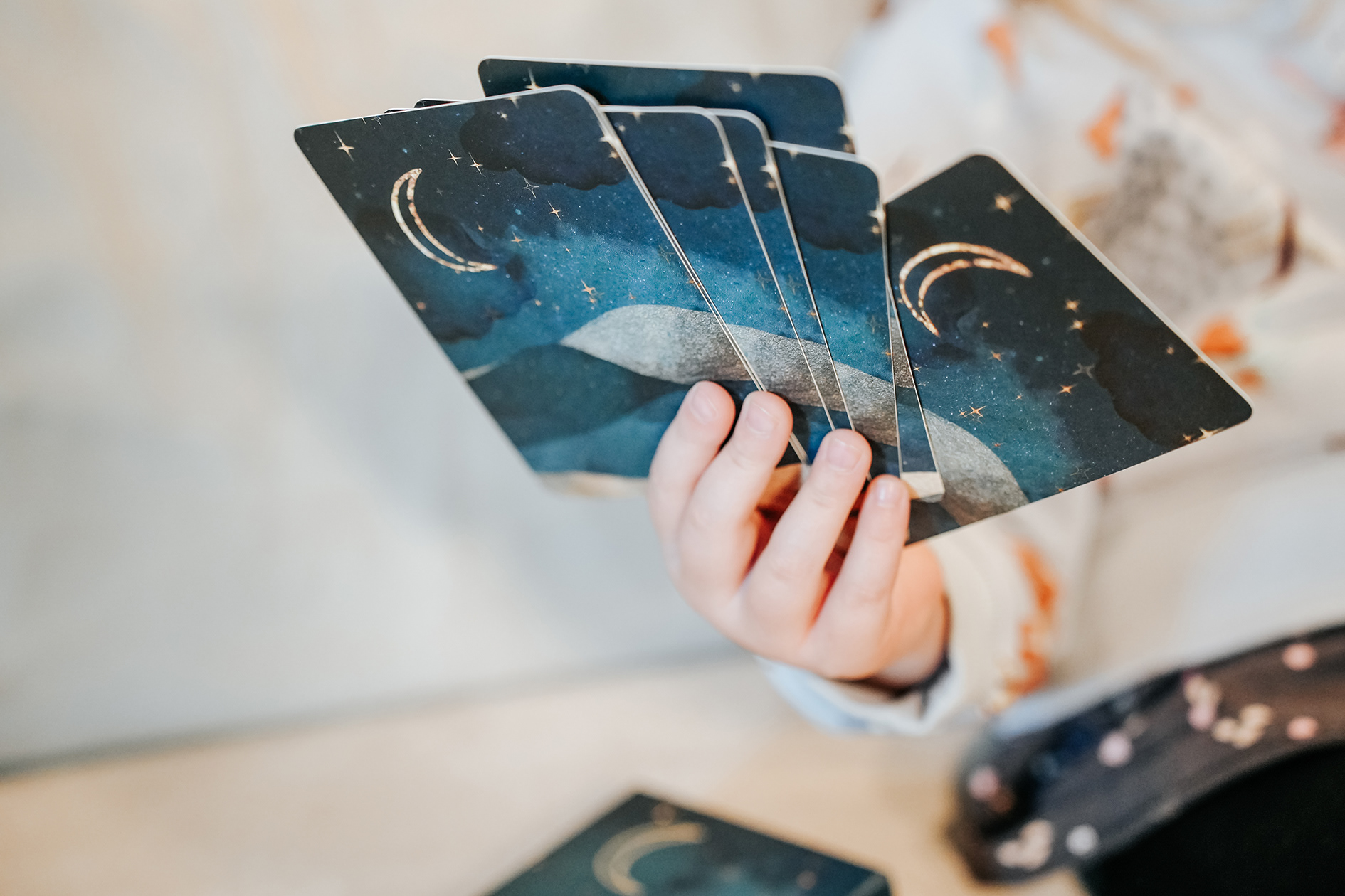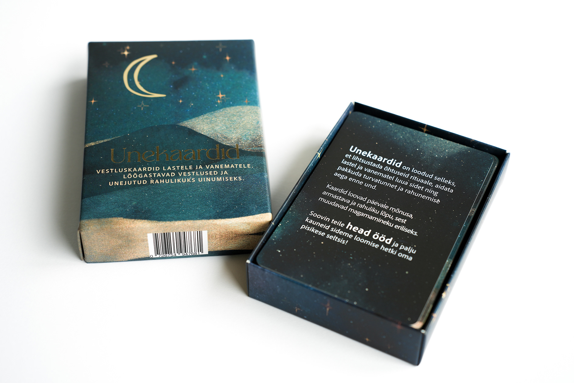 Kujundasin koostöös kliendiga unekaardid, mille visuaalne keel kasvab välja autori tekstidest ja nägemusest. Komplektis on 50 kaarti, mis toetavad last enne und. Need aitavad rahuneda, tunda end hoituna ja pöörata tähelepanu oma enesetundele. Samuti saab laps jagada vanemaga enda päeva jooksul kogetud tundeid ja tegemisi.